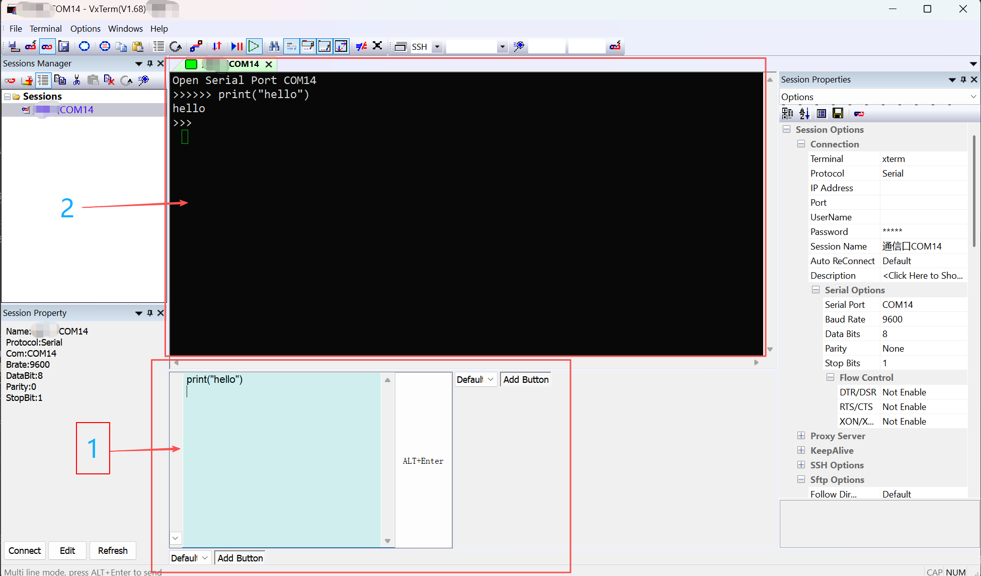 在 VxTerm 中输入多行时:在命令框输入或粘贴完整代码块,再使用 Alt+Enter 整行发送(若软件支持多行一次性发送)。